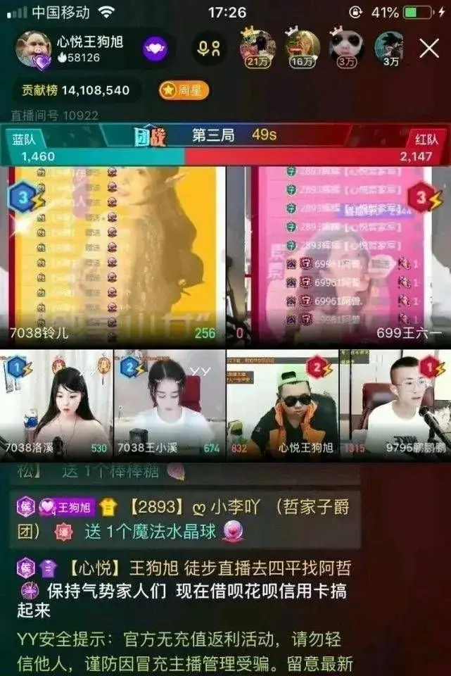 之前心悦不少的主播都出了丑闻,最出名的是阿哲的现实兄弟偷刷神豪宝宝Y币的事情,此事更是一度成为YY游客吐槽心悦公会的槽点之一,而今天有网友发现阿哲旗下的主播王某直接在公屏上打字动员粉丝去贷款刷礼物,前段时间有关部门刚刚下达了针对此类事件的整顿公告,之前更是连码手都一度违规了,这主播这是属于顶风作案啊,不管是不是在开玩笑的,但是身为主播打出这样的言论属实有点不合适,不知道后续YY方面会不会给予一定的处罚!祸从口出,主播们还是且行且珍惜吧!