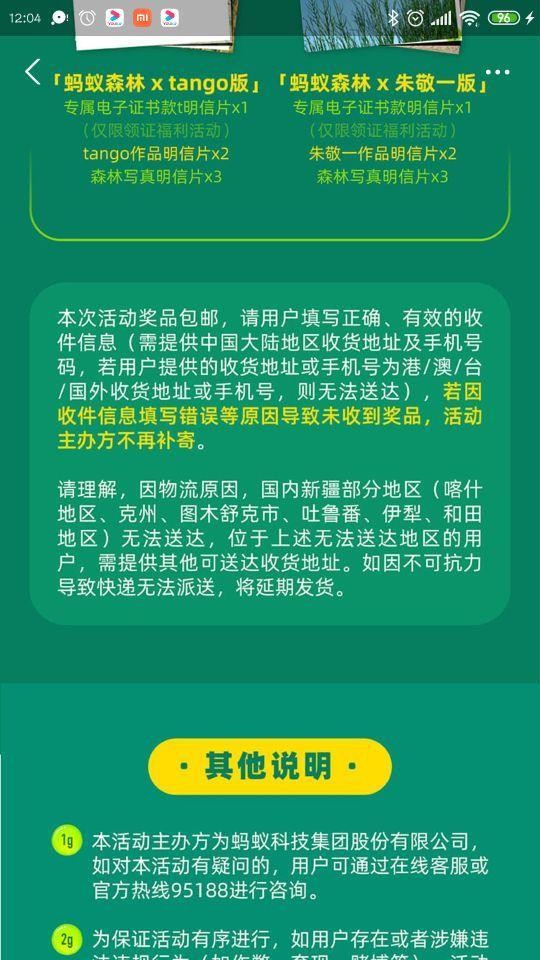 支付宝蚂蚁森林免费实物领证书+明信片了