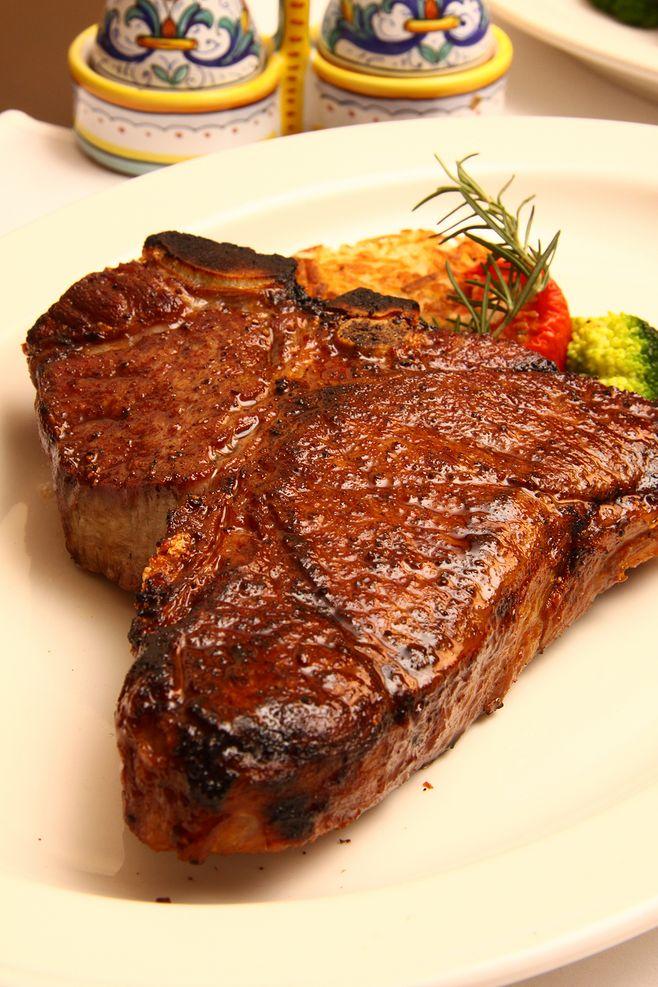 T-bone steak ( 丁骨牛排,取自牛的前腰脊部位,所以骨头是脊骨,连着一片Sirloin牛排和一片strip牛排)