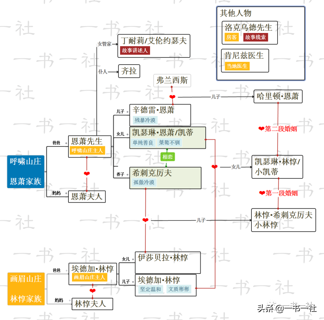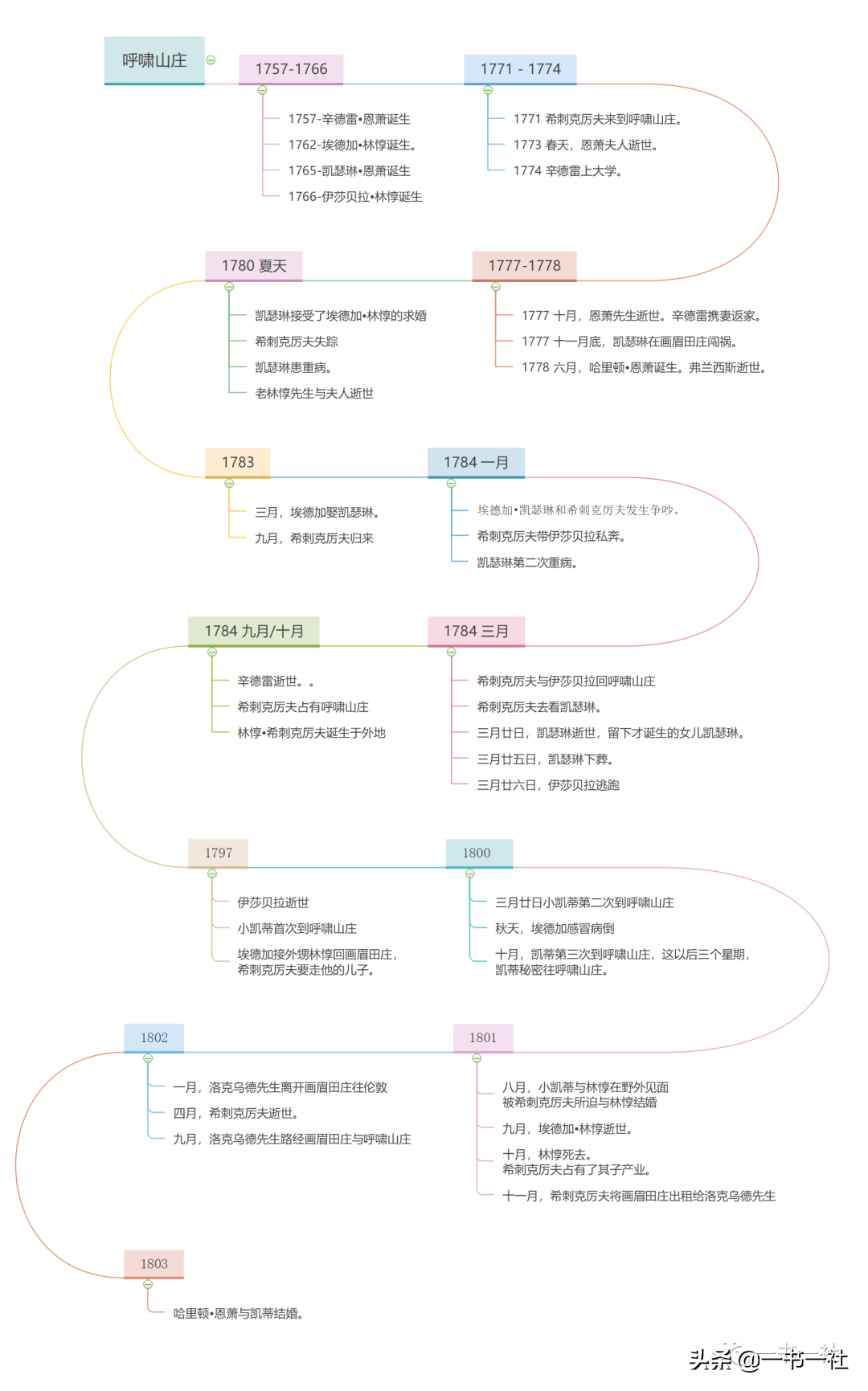 图谱导引:书中主要就是围绕:希刺克利夫和凯瑟琳的爱恨纠缠展开,给我们描绘了个畸形社会的生活,以及在这种生活中被扭曲的人性。图谱后面还根据书中发展脉络,整理了故事脉络【不喜欢剧透,可以跳过O(∩_∩)O~】