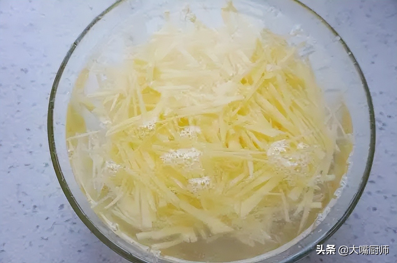 2、用盐醋水浸泡,能让土豆丝颜色鲜亮不发黑,口感更爽脆。
