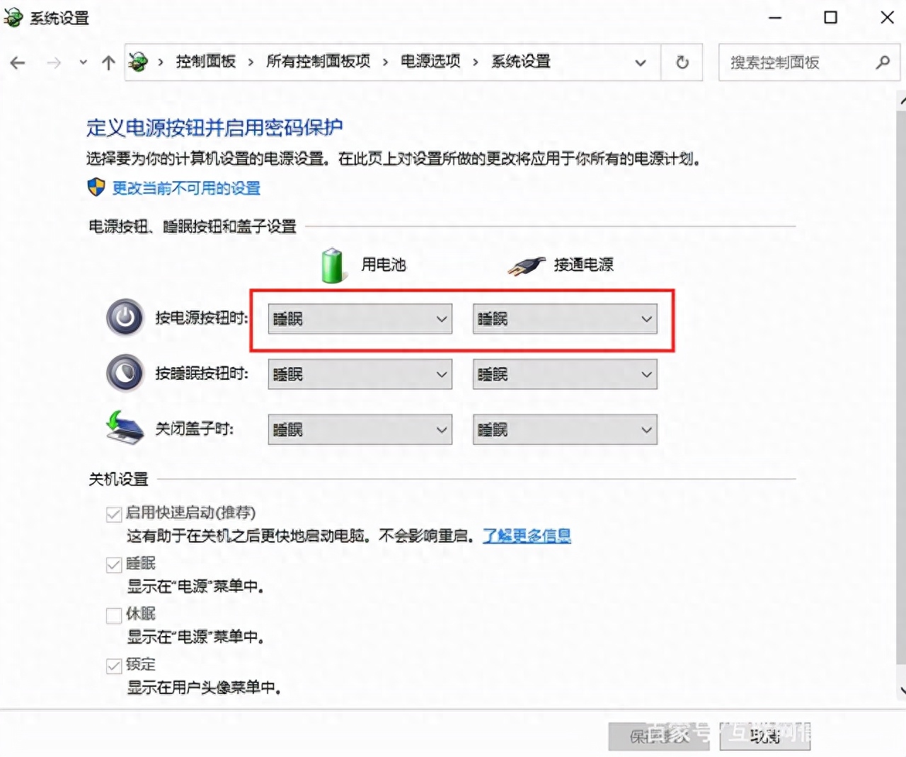 4、最后把“按电源按钮时”,用电池和接通电源都设置为“睡眠”即可。