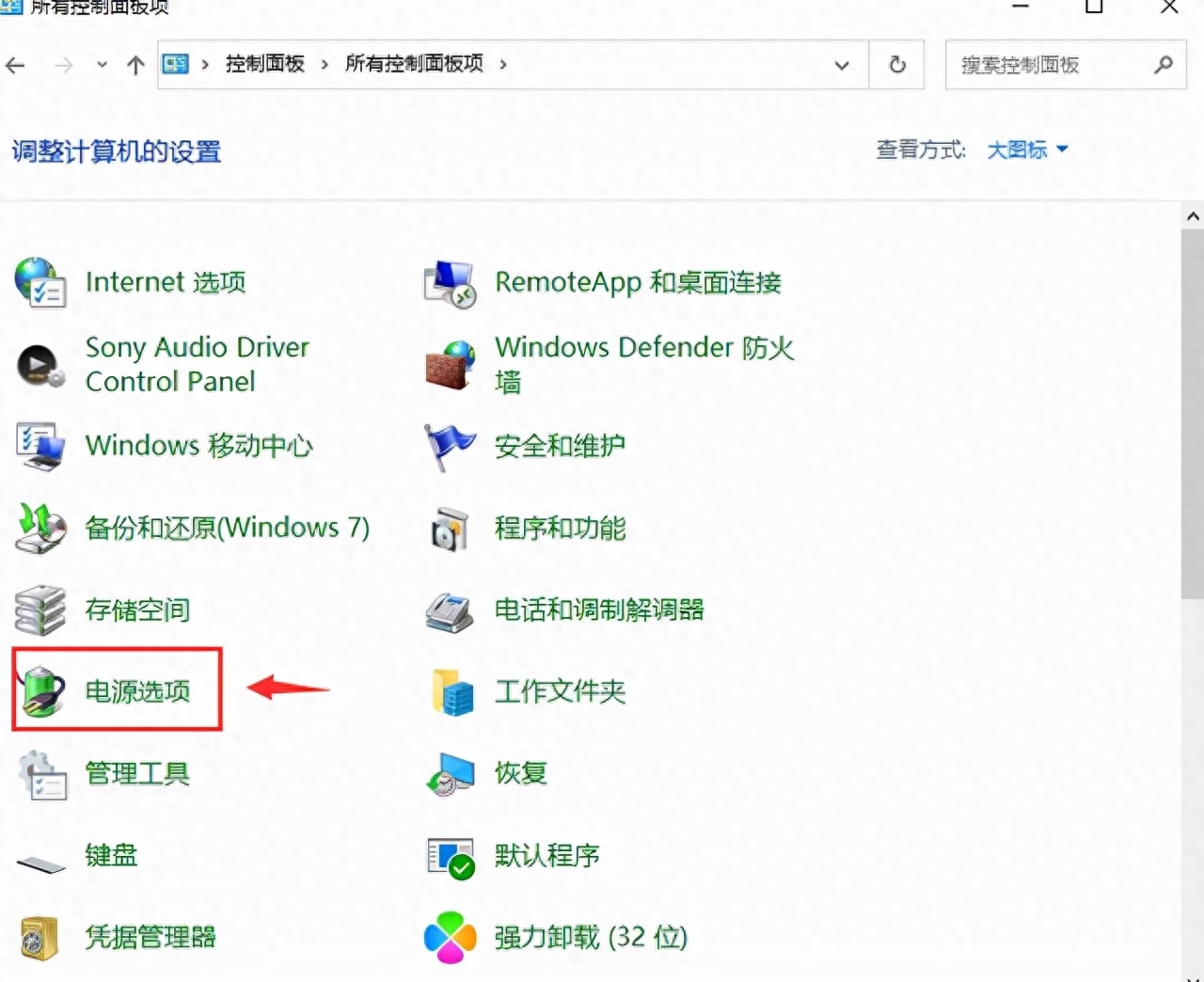2、在控制面板界面中找到“电源选项”,并点击进入;