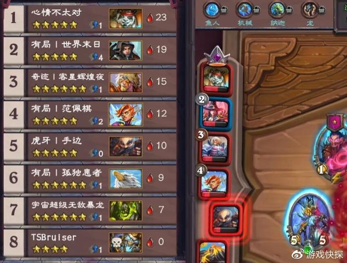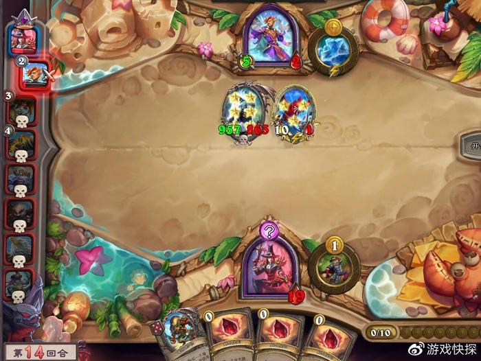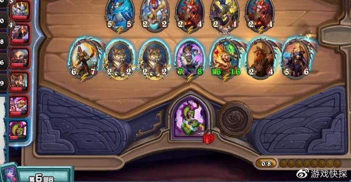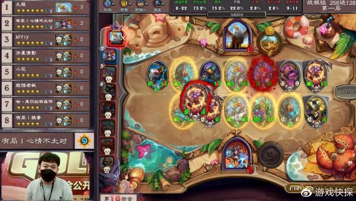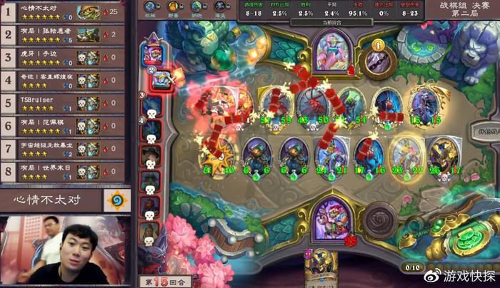 因此,这局游戏大家发育和游戏节奏都非常快,仅仅第10回合就有一名选手阵亡,而且除开前二的两人,其余所有选手的血量都不超过15点。可想而知比赛对局激烈程度,每回合一丁点发育和提升都至关重要。