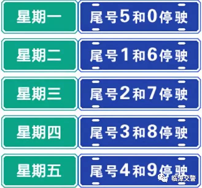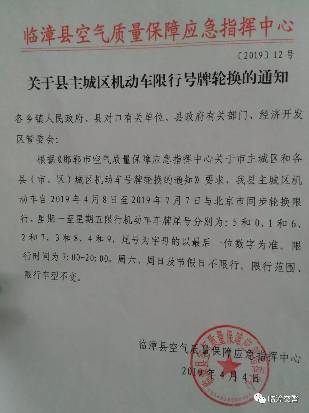 接临漳县空气质量保障应急指挥中心通知;2019年4月8日起临漳县主城区继续实施常态化限号措施,并与北京市保持同步轮换。工作日7:00—20:00,对机动车实施限行两个尾号;周六、周日及法定节假日不限号。限行尾号:周一:5和0;周二:1和6;周三:2和7;周四:3和8;周五:4和9;含临时号牌,尾号为英文字母的以倒数第一位阿拉伯数字为准。