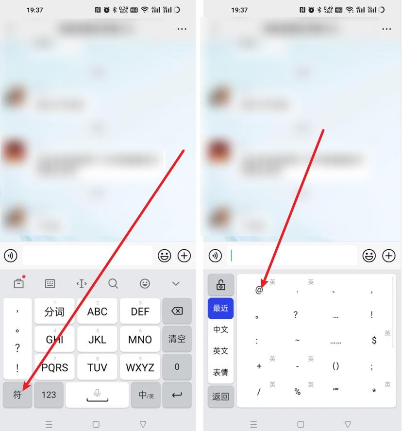 2、接着在键盘中找到并点击【符】,然后在符号里找到【@】符号,如下图所示:
