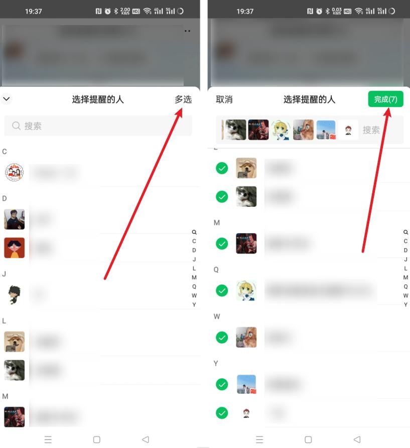 3、输入@符号后就会出现需要选择艾特的群友,这时我们点击右上角的【多选】,然后勾选所有群聊的好友,再点击完成即可艾特群里所有人;