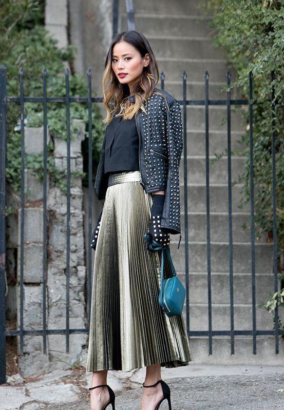 半身裙稍微带有金属感的设计面料质感相当高级,细腻的百褶又精致又高雅。纯黑色简约高跟鞋搭配拉伸了腿部曲线。上半身是一件较短设计款式的内搭与机车黑色夹克搭配,飒酷率真气息很惊艳。尤其是外套上布满铆钉元素,突出帅酷洋气魅力。青色手提包虽然很小巧,却也渲染了不少稳重端庄韵味