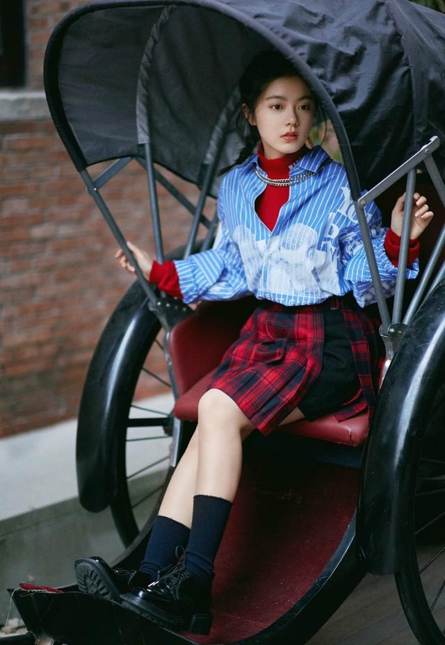 新生代女星赵今麦百褶裙+修身打底衫的这套造型玩转可爱灵动俏丽气息。上半身大红色修身内搭很是亮眼,与白条纹蓝色打底衫进行叠穿,轻柔又高雅。下半身是一款红黑色拼接的百褶超短裙,大红色颇有节日气氛特别喜庆。黑色长筒袜搭配精致小皮鞋,整体穿法细节感把握的很优秀