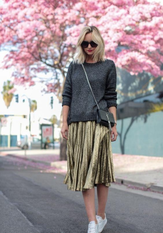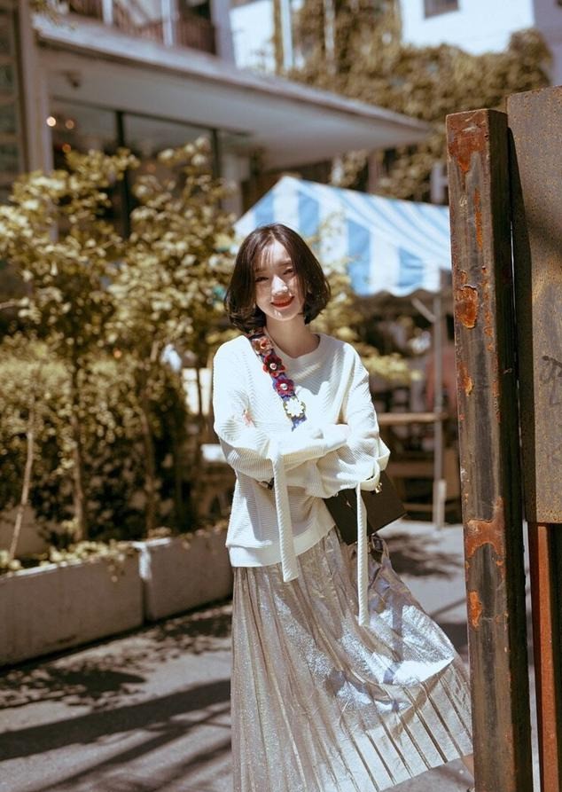 这件高级灰套头毛衣穿法休闲,送款宽松的板式蕴含着几分慵懒保暖韵味。下半身搭配的是一件金色百褶裙,飘逸裙摆与小白鞋融合造型特别百搭。百褶裙+套头毛衣这种搭配style非常适合秋冬,松垮闲适而且不乏时髦温婉格调