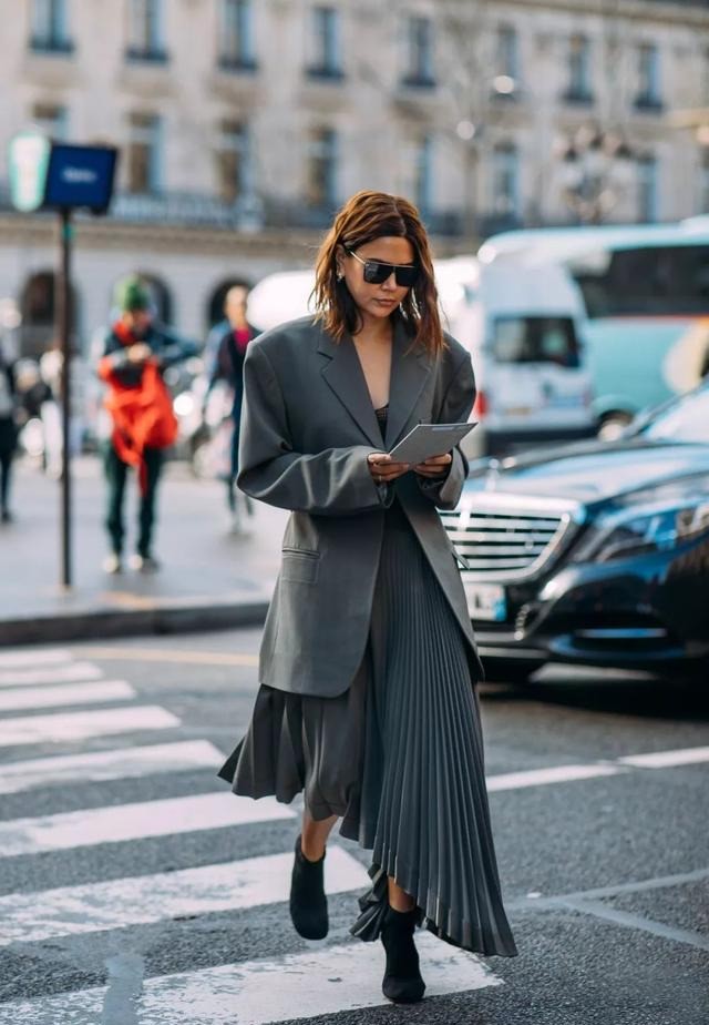 左右两侧长短不一的百褶长裙高端雅致,而且这种别具风格的设计款相当有个性,同时也性感高阶。上半身凹上一件男友风宽松西装外套,很干练更有欧美高级风范