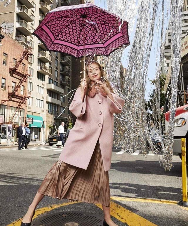 撑起粉色印花雨伞,瞬间整幅画面都充满了浪漫高雅格调。粉色宽松大衣高雅并且恬静又休闲,精致的纽扣增加高贵风韵。半身裙采用卡其色设计端庄更柔美,黑色高跟鞋搭配又添简约贵气风格。整套造型不仅闲适大气,也富有高端艺术创造力