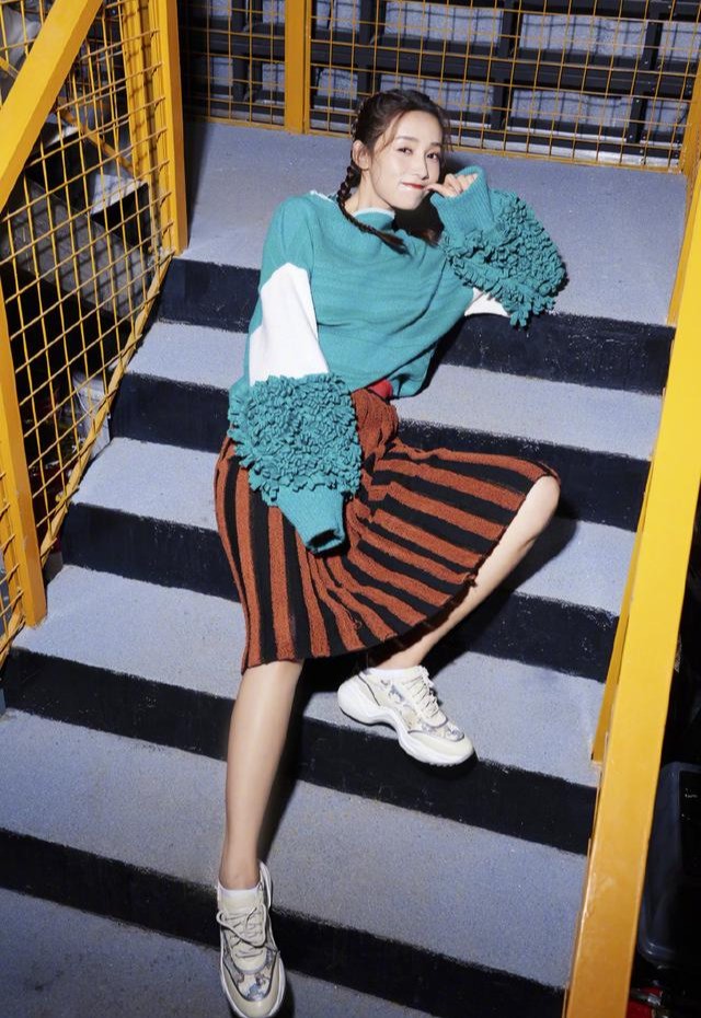 李若宁这套百褶裙搭配套头毛衣的造型相当休闲温柔,同时富有活力动感之韵。上半身套头毛衣采用蓝白色进行拼接,格调清新又突出温婉气息。半身裙采用黑色与棕色线条拼接设计,一方面增添俏皮风采,另一方面也从视觉上拉伸了双腿曲线。搭配白色老爹鞋更显灵动感,气质尤为出众