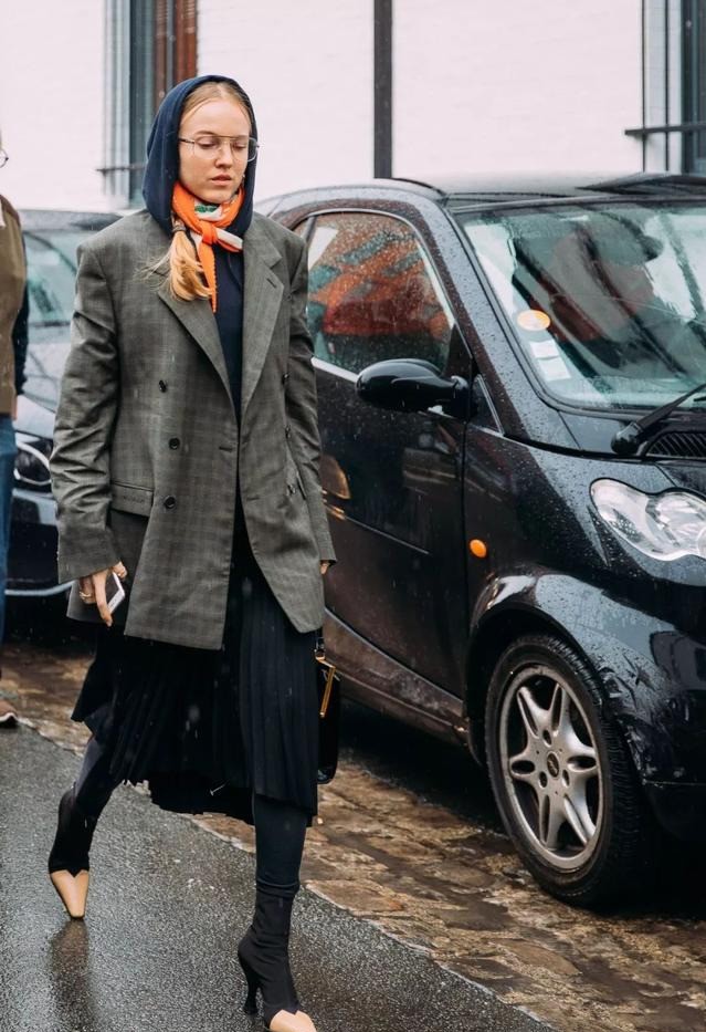 西装外套富有酷感庄重气息,搭配飘逸浪漫的百褶裙单品,混搭格调特别洋气。上半身是一件灰色格子小西装外套,内搭黑色卫衣更显休闲气息。一条亮橙色丝带点缀,增加了街头潮酷魅力,又让整体穿搭不那么沉闷。黑色打底裤搭配的百褶裙也是黑色,稳重大气穿法特别高级