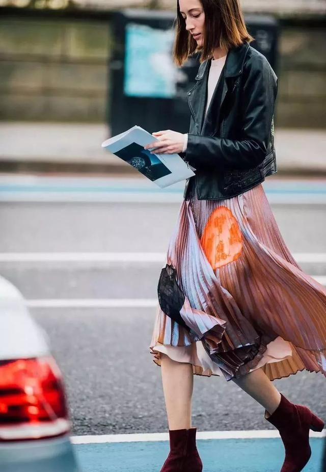 裙摆飘逸的深粉色百褶裙柔美又拉风,橙色黑色薄纱进行点缀,增加高端艺术风情,裙摆采用的是双层纱设计,将仙女时尚风韵突出。酒红色革面马丁靴散发成熟高级质感,上半身的短款机车夹克增添个性酷感魅力。行走的街头时尚气息相当洒脱惊艳