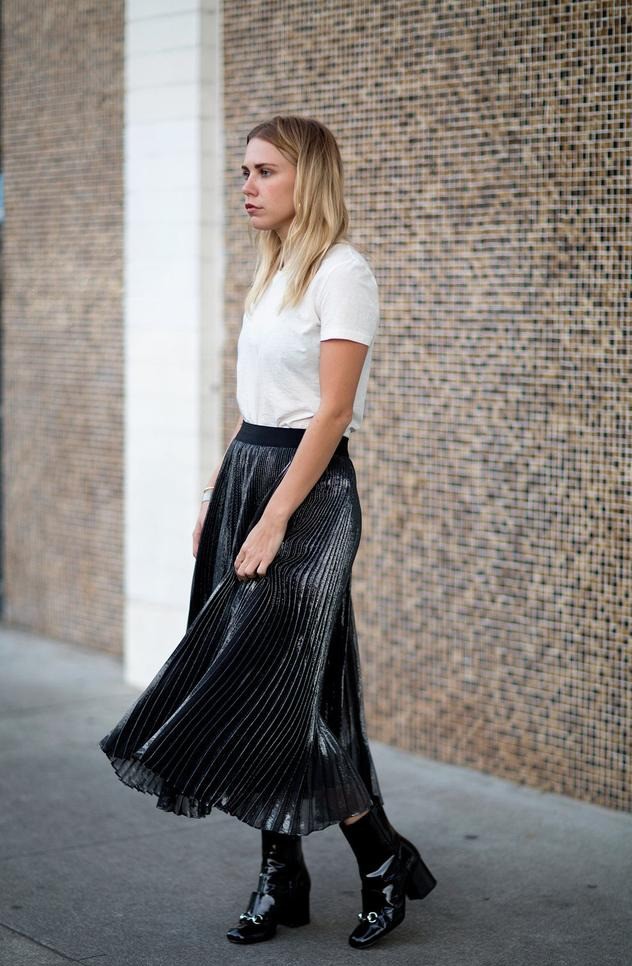 机车皮夹克披在肩膀上的造型,总能应在出特别飒酷洒脱的时装魅力。白色短袖做休闲内搭很简约,塞入百褶裙突出腰际线条。百褶裙这次搭配的是一条到膝盖的短款设计,不仅时尚潇洒同时突出性感意蕴,又搭配黑色中筒皮靴,高级又霸气