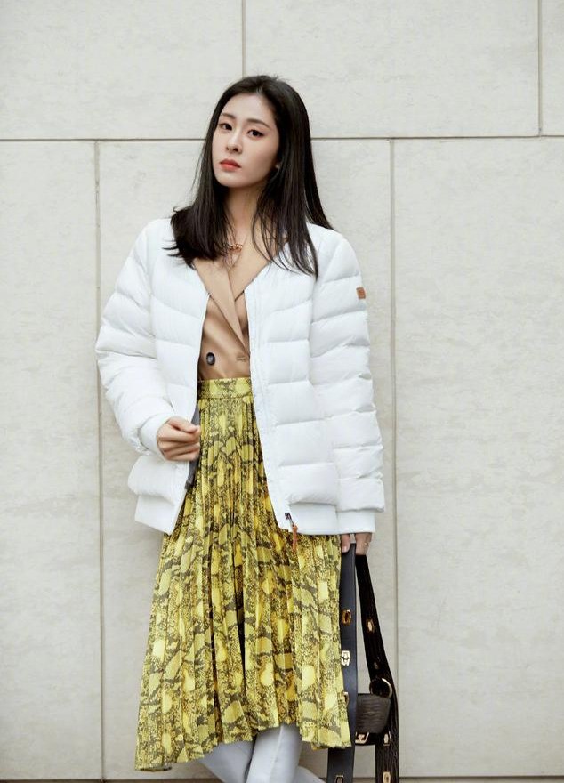 这条黄色百褶裙富有浓厚艺术风情,尤其是裙摆还带有些许弧度设计,更显温柔时尚韵味。上半身内搭是一件翻领单排扣外套,这样的穿法很个性。外凹一卷纯白色棉服,简约设计风格不失保暖气息。搭配宽肩带包包越发时髦有型,其中也增加了不少酷感风韵