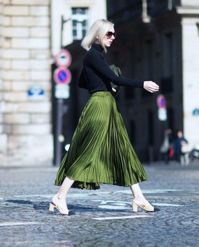 将打底衫塞入百褶裙的造型搭配巧妙提高腰部曲线,显得整个人身材都很纤长高挑。上半身的纯黑色设计低调中不乏性感朝气魅力,百褶裙深绿色调又显活力高雅风韵。阔步走姿展现出飘逸裙摆,搭配米黑二色结合高跟鞋,更显精巧拉风街头时尚风韵,同时这样的搭配也非常适合职场style