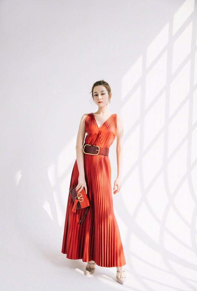 迪丽热巴身上的这件连衣裙采用端庄百褶设计款,红色皮质温婉高端。无袖款式不仅突出有没蝴蝶骨,而且双臂白嫩又纤长的曲线十分迷人。深棕色腰带散发着独特精致时尚气息,浅棕色高跟鞋更添温婉恬静韵味。手拿包与长裙造型的色调搭配很是协调,马尾造型利落俏丽,青春优雅style非常惊艳