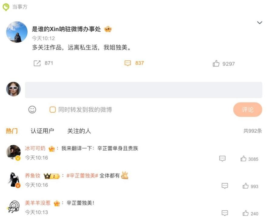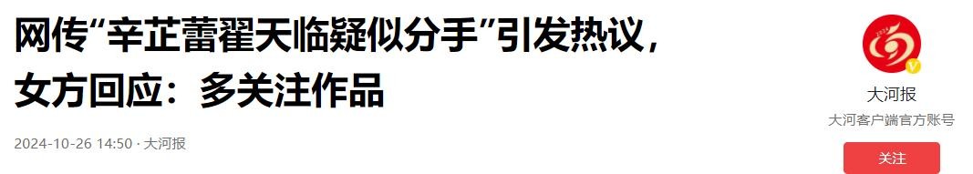 就在2024年10月26日,辛芷蕾的助理回应了此事,她称让大家“多关注作品,远离私生活,我姐独美。”