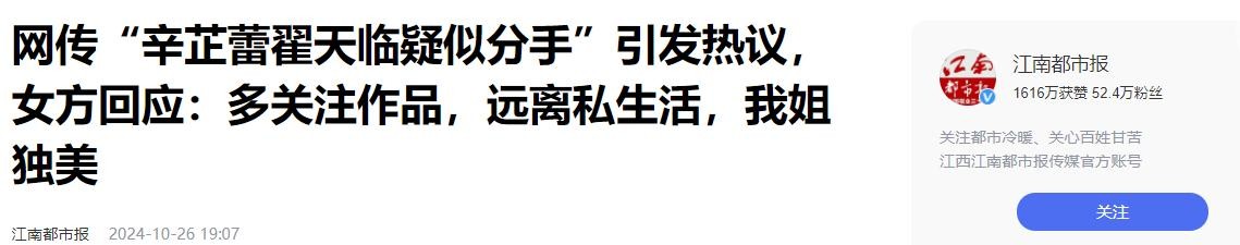 江南都市报:网传“辛芷蕾翟天临疑似分手”引发热议,女方回应:多关注作品,远离私生活,我姐独美