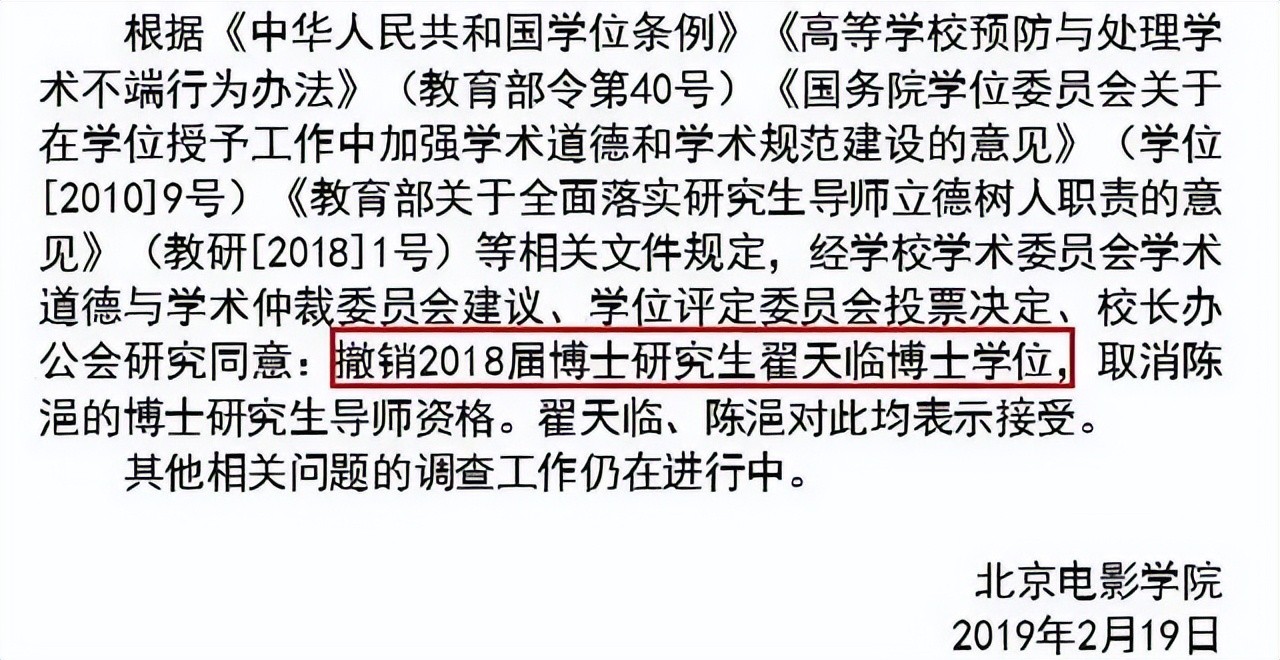 紧接着,北京电影学院也宣布撤销其博士学位。