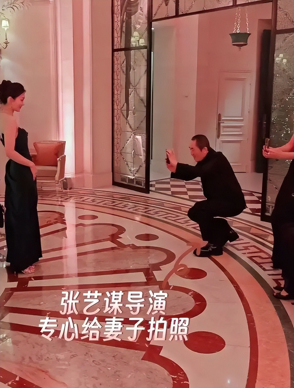 在大庭广众之下,张艺谋拿起手机为爱妻拍摄照片,现场也是不顾身份下蹲拍照。
