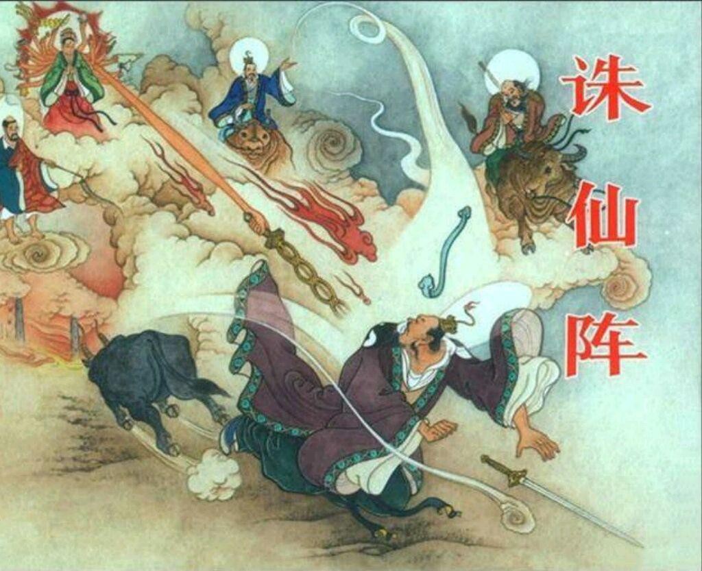 诛仙阵内有四口宝剑,分别是正东诛仙剑、正南戮仙剑、正西陷仙剑、正北绝仙剑。昆仑山众门人前来观阵,多宝道人仗剑而出,欲寻广成子的晦气,二人战成一团。广成子祭起番天印,正中多宝道人后心,多宝道人跌了一跤,逃回阵中去了。