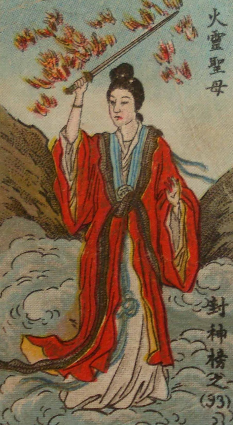 佳梦关前大战,火灵圣母的金霞冠放出金光,约有十余丈远近。姜子牙看不见火灵圣母,被火灵圣母刺伤,拨转四不相逃走。火灵圣母追至切近,又用混元锤打中姜子牙的后心,姜子牙跌下四不相。火灵圣母下了金眼驼,来取姜子牙首级。广成子作歌而至,大战火灵圣母。火灵圣母现出金霞冠金光,广成子内穿着扫霞衣,将金霞冠的金光一扫全无。火灵圣母大怒,仗剑来砍。广成子祭起番天印,正中火灵圣母的顶门,打得脑浆迸出。广成子收了番天印和火灵圣母的金霞冠,取丹药救姜子牙活命。