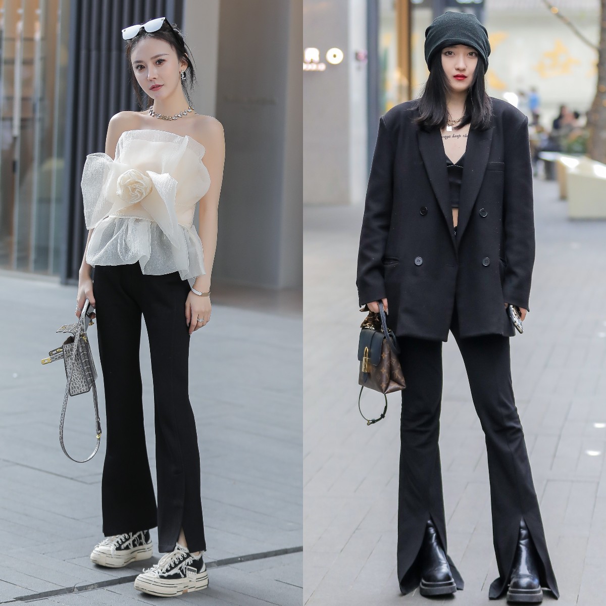 在挑选喇叭裤的时候,其实需要注意的地方不多。而其中最重要的就是裤脚的设计,裤脚带有开叉设计的喇叭裤,不仅能在视觉上延长小腿线条,还能给人一种个性时髦的气质感。