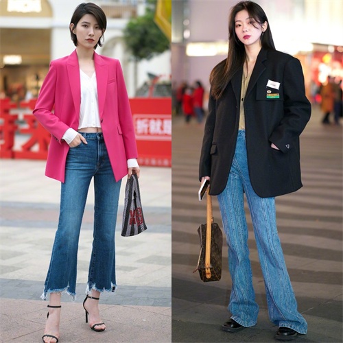 而在搭配喇叭裤的时候,大家要多去选择宽松版型的西装外套,西装如果太过修身,会给人一种太过刻板的感觉,从而和喇叭裤的风格相互冲突,降低了造型档次。