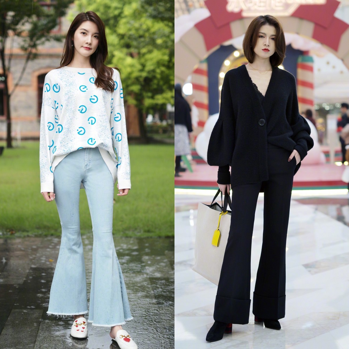 高腰的喇叭裤既能切割身材比例,还能给人更为干练率性的气质感。而低腰喇叭裤更多的是一种媚俗感,驾驭难度也很大,大家还是需要避开的。