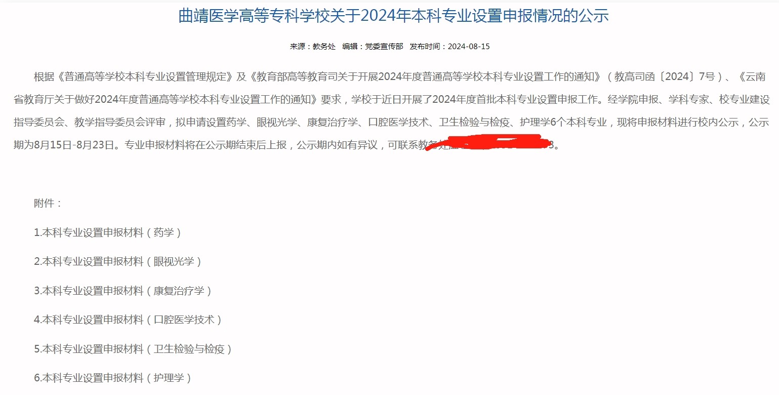 2024年8月15日,曲靖医学高等专科学校发布了《关于2024年本科专业设置申报情况的公示》,拟申请设置药学、眼视光学、康复治疗学、口腔医学技术、卫生检验与检疫、护理学6个本科专业。我们期待,曲靖医学高等专科学校早日升本成功,更好服务于民族边疆地区和基层医疗卫生事业和高等教育发展。