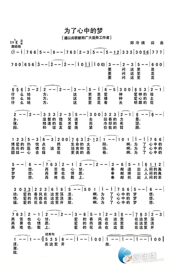 《为了心中的梦》是一首献给战斗在抗疫一线医护人员的歌,由著名词曲作家郑冷横先生在全国上下众志成城、共同抗击新型冠状病毒感染的肺炎的“非常时刻”创作,并制作了音乐视频。作品歌颂伟大、无私的医护人员,满怀深情地表达了对白衣天使们无私奉献、大爱无疆的赞扬与祝福,激发医护人员打赢“疫战”的信心。