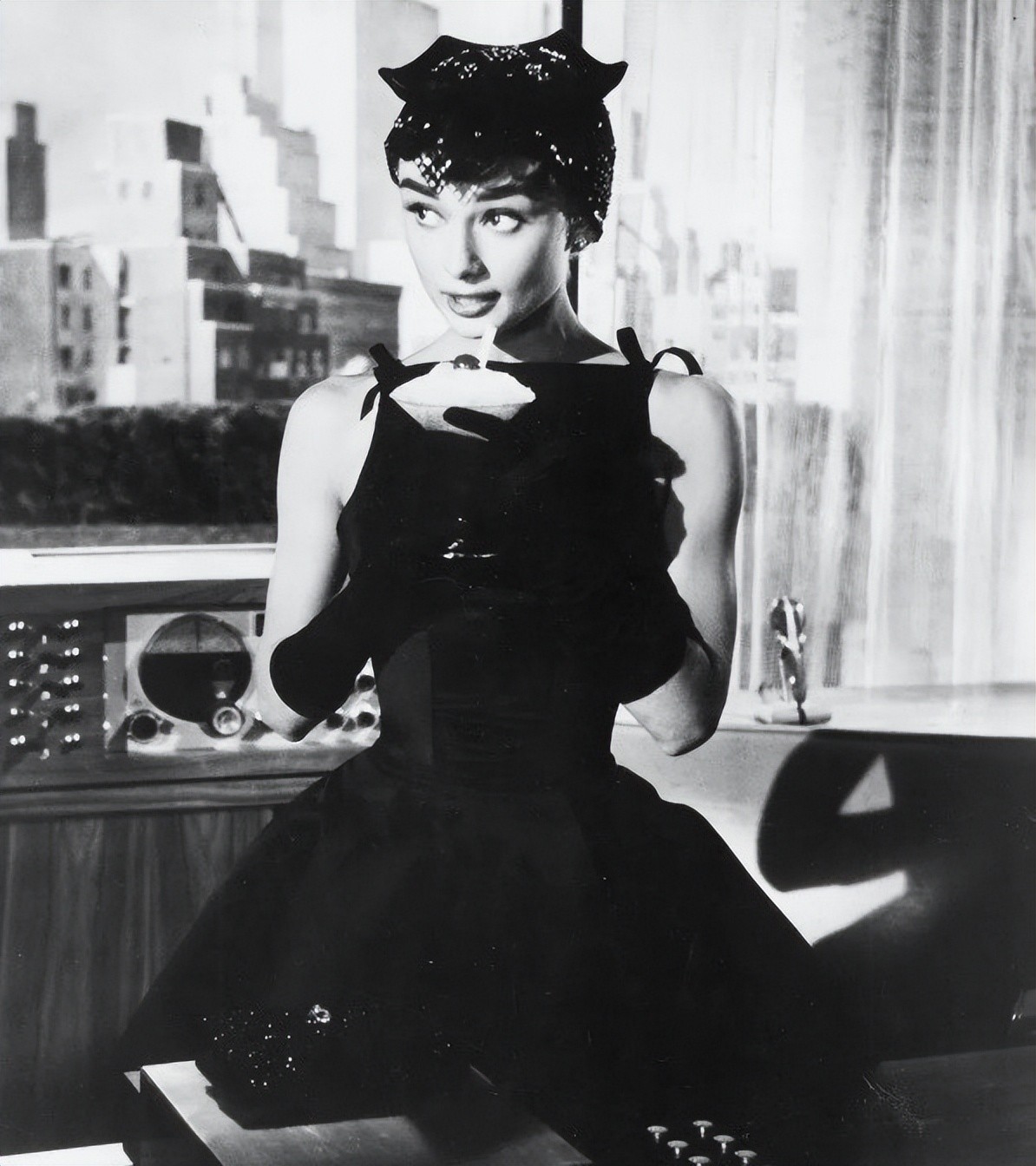 这件黑色鸡尾酒裙设计新颖,肩部有两个蝴蝶结,让赫本看上去天真灵动又俏皮。