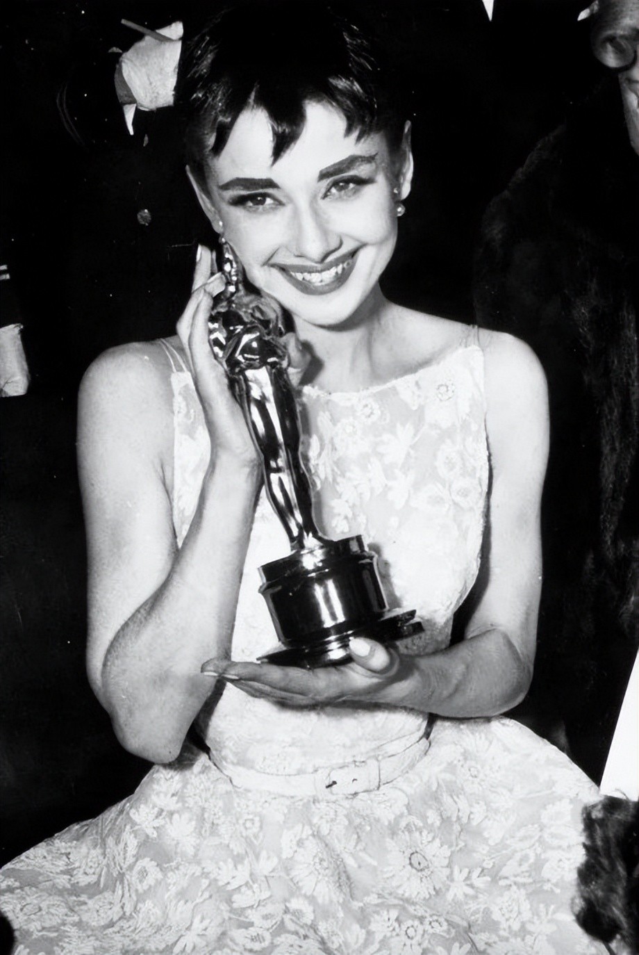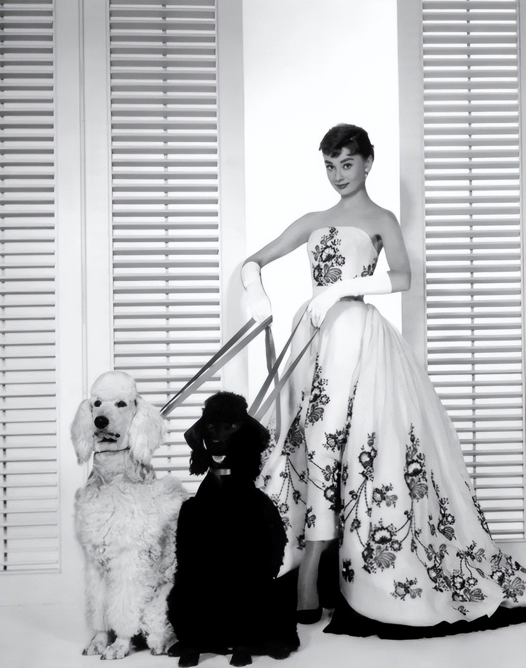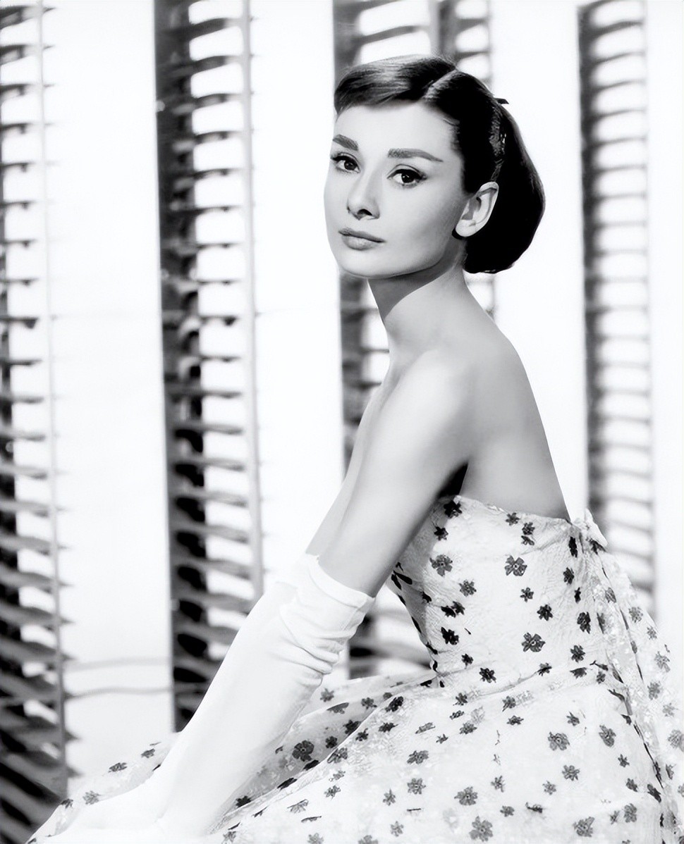 这件抹胸晚装唯美而又华丽,身着晚装的赫本就像一位高贵的公主,光彩照人,星光熠熠。