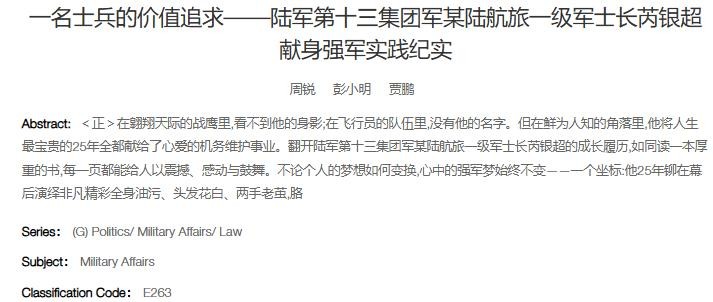 参考资料:一名士兵的价值追求——陆军第十三集团军某陆航旅一级军士长芮银超献身强军实践纪实 - CNKI