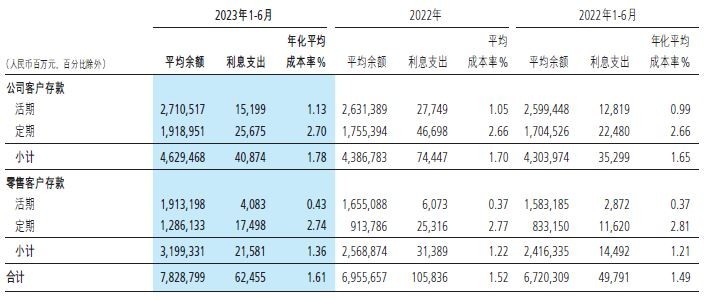 但是,让我感到奇怪的是招行负债成本,特别是存款成本的上行。二季度存款成本环比上升了4bps。这点着实让我感到费解。因为从去年9月分开始,央行已经多次通过下调存款自律利率,下调协定存款加点上限的方法限制存款成本。结果,招行最近4个季度的存款成本反而在持续上行从去年3季度的1.54%,4季度的1.55%,到今年的1.59%,1.63%。怎么越降息存款成本反而越高了呢?我特意调取了招行的存款成本,如下图2所示: