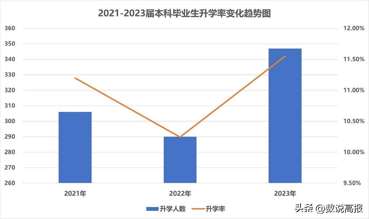 从下图可以看出,2023年升学人数和升学率均为近三年新高。