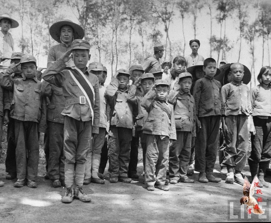 31. 向来访的美国军事观察员的问候敬礼的孩子。河北,1940年