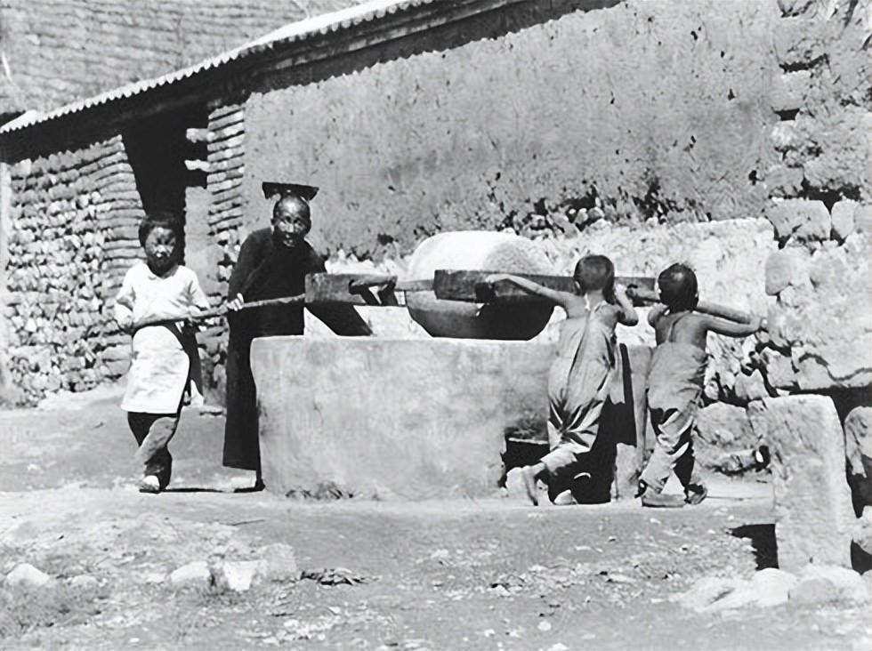 06. 1924年,热河(承德),推磨。石磨常见于北方农村,靠人工或畜力推动