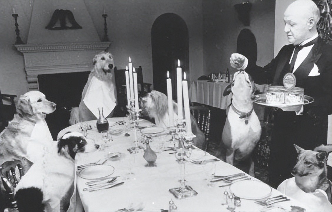 22. 约1984年,在英国伦敦的一家餐厅,一位管家正在给狗狗们喂饭。