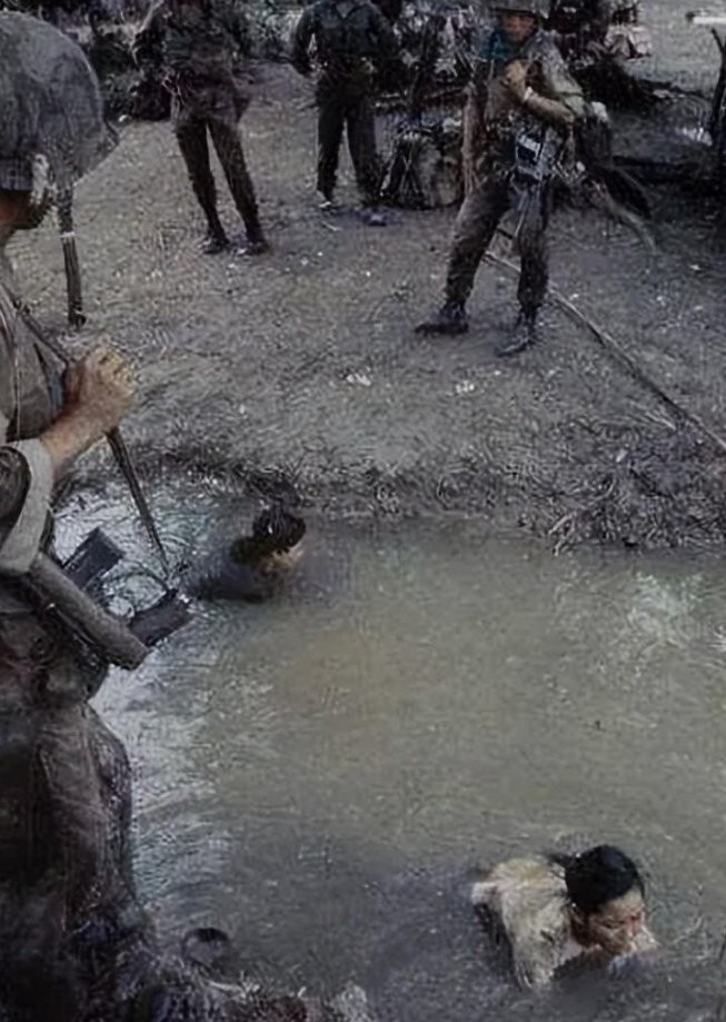 39. 美军正在戏弄一个越南女兵,她正在水里打滚