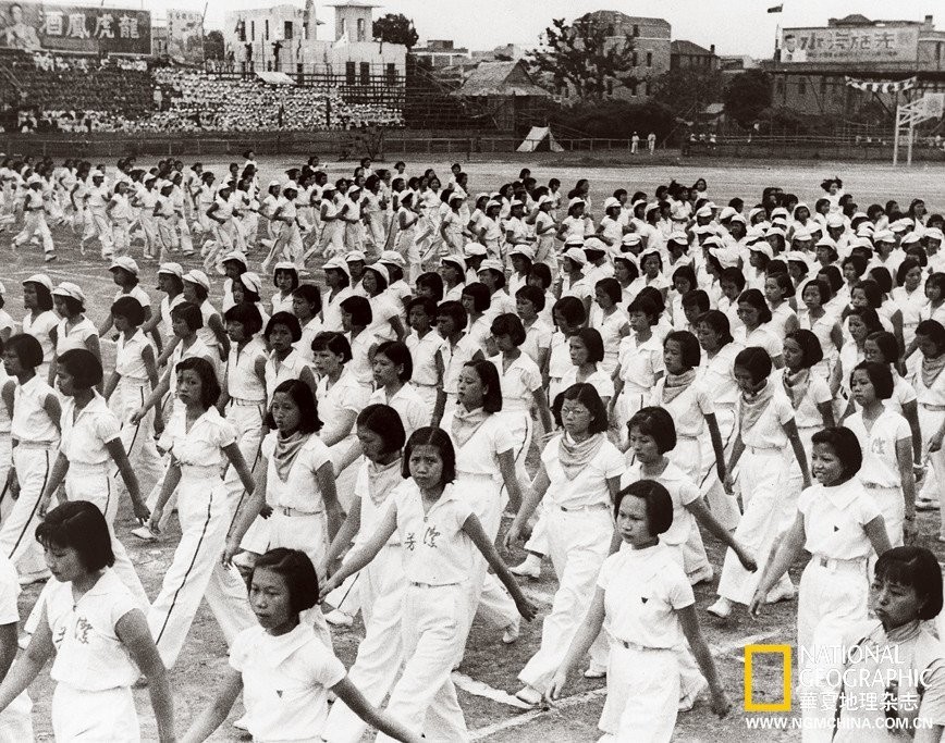 19. 【广州】(1937年12月号)看台上常有裹着小脚的母亲,张望着场内脚踩运动鞋的英武的自家女孩儿。举办于1937年5月的一场运动会上,来自多所学校的团体进行了队列表演、拔河、健身操等等,这些女生活动再不久前还被认为是有伤风化的。