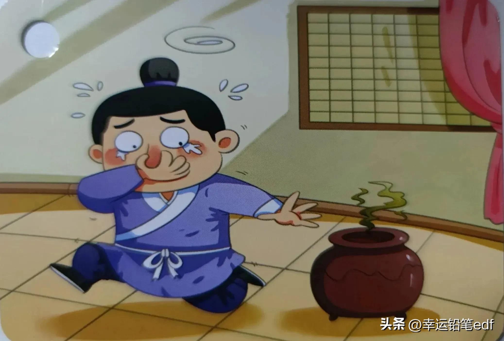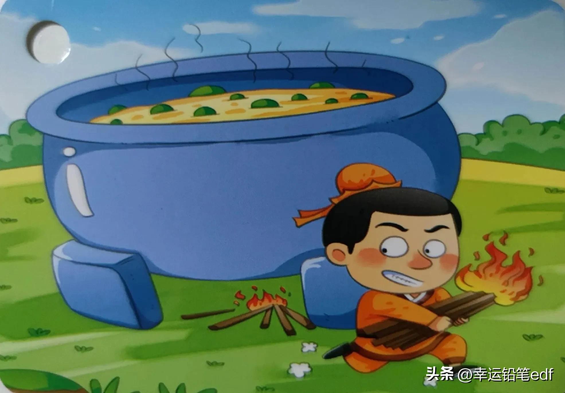 图四:看到一个大锅正在烧着热气腾腾美味的汤,于是一个顽童将锅底的柴火抱走了。