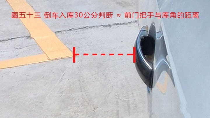 通过后视镜判断车身与库角 30公分,约等于“库角角尖与前门把手30公分”,必须清楚的知道参照点位是哪里,这一点十分重要。