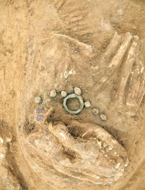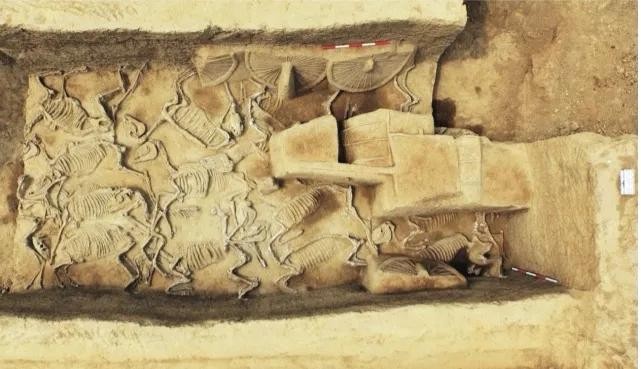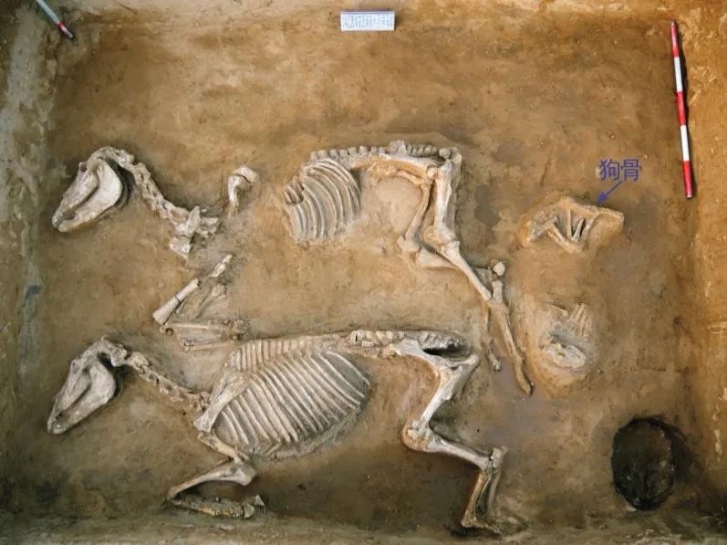 在该墓地还发现马坑5座,均埋葬2匹马,头向西,4座有狗骨。车马坑1座,盗扰严重,残留2辆车,6匹马,头向东。