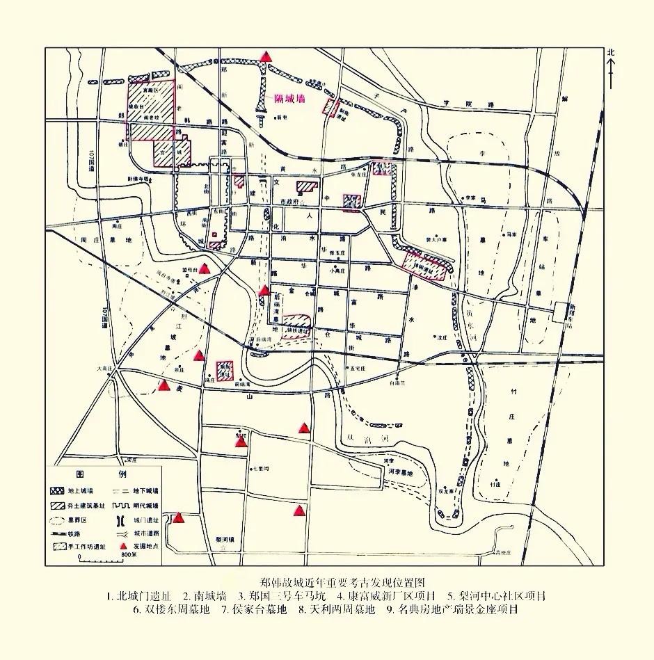 近年来,为配合郑韩故城考古遗址公园和地方经济建设,河南省文物考古研究院新郑工作站对北城门、南城墙、三号车马坑、双楼、天利等遗址和墓地进行了考古发掘,发掘面积10余万平方米,发现东周至唐宋时期的道路、瓮城、墓葬、灰坑、陶窑、车马坑等遗迹,出土各类质料的文物数万件。