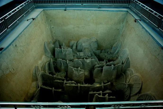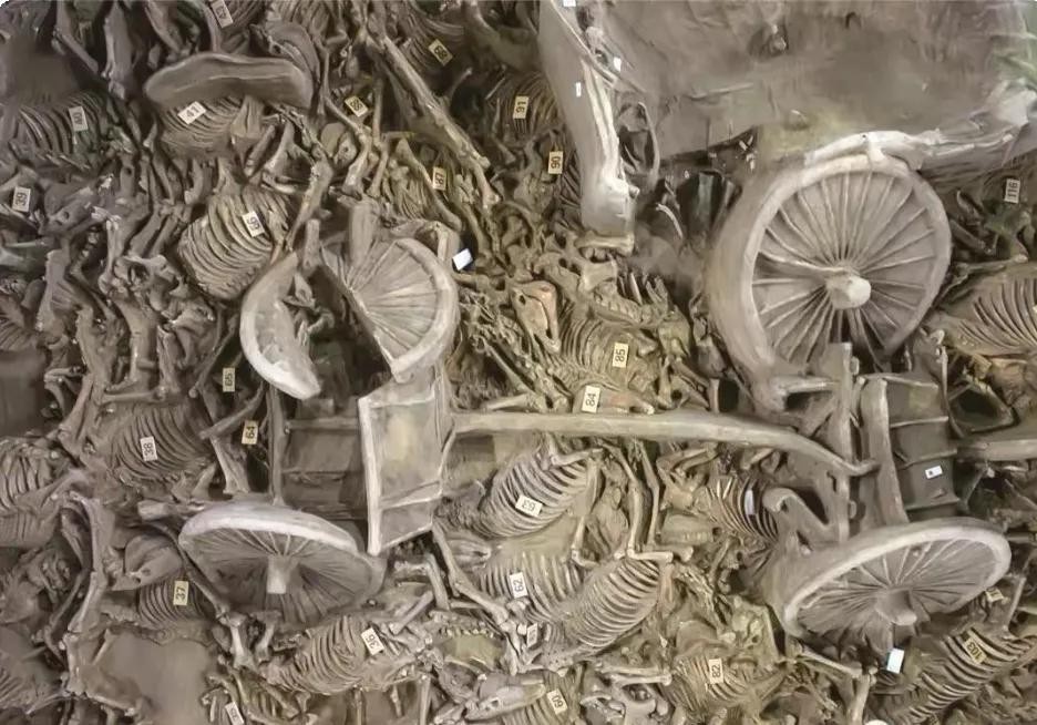 其中一号车马坑残长8.30米,宽3.80米,共清理出4辆车、18匹马、1只狗。车由东向西排放,相互叠压;马分五排埋放,第一排马被M28、M29打破,仅剩2匹马的腿骨,第二、三、四、五排均为4匹马。