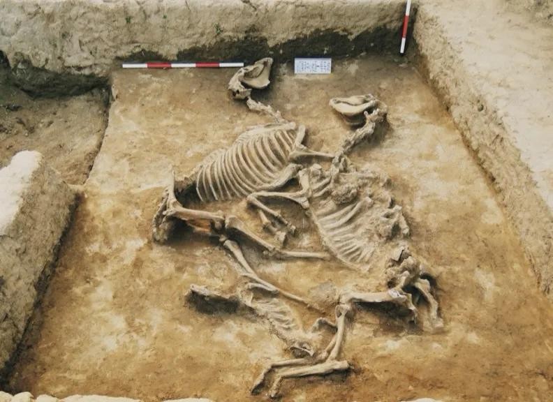 该坑为南北向近长方形竖穴土坑状,口大底小。坑口南北最长11.7米,东西最宽10.6米,深7.5米。坑底清出至少124匹马骨,马骨绝大部分呈头向西的侧躺式摆放,东西向5列。经鉴定,这些马匹均为七八岁左右的成年公马。